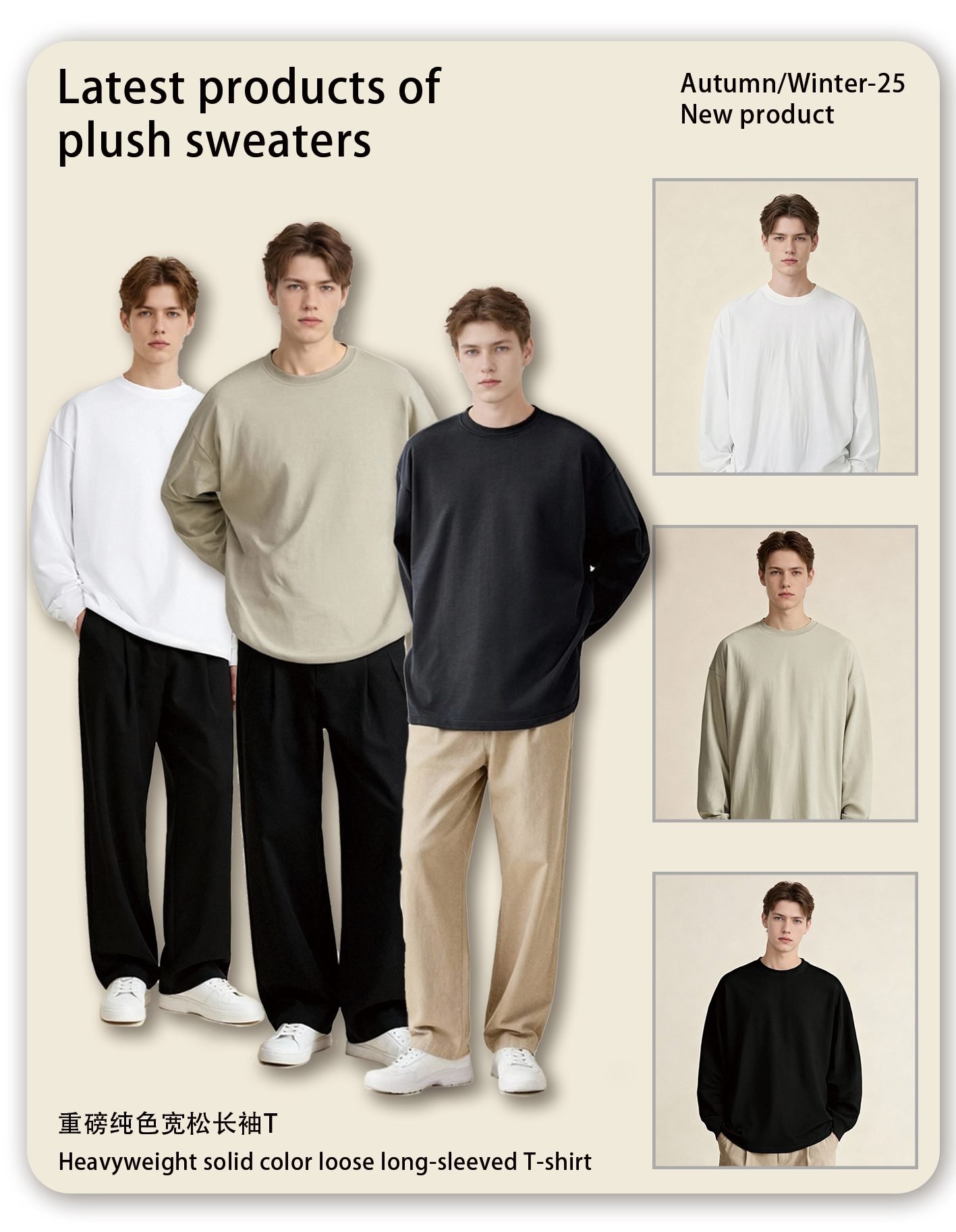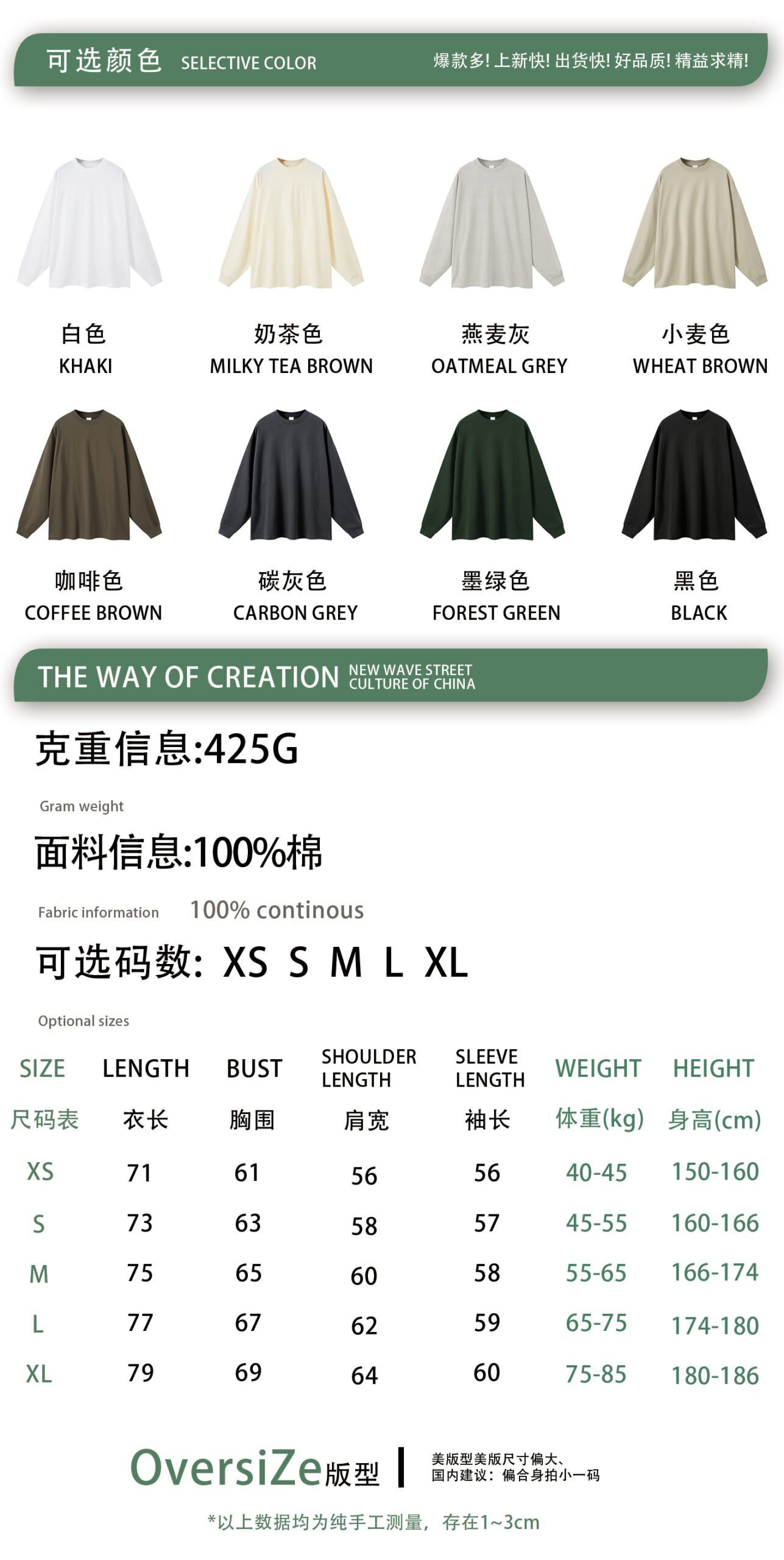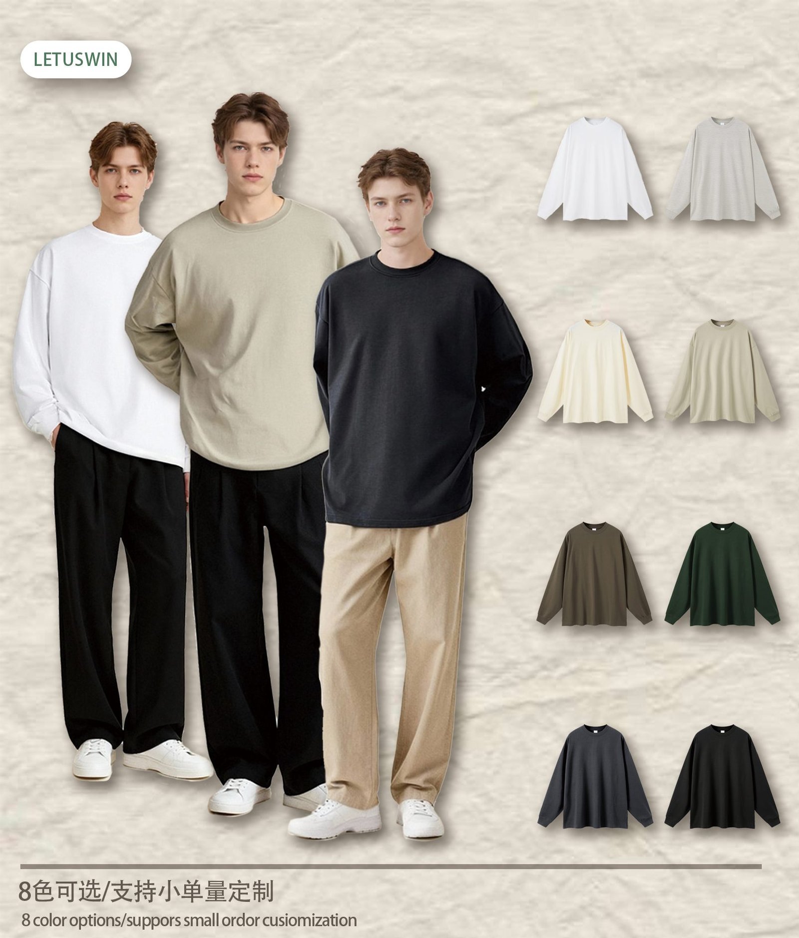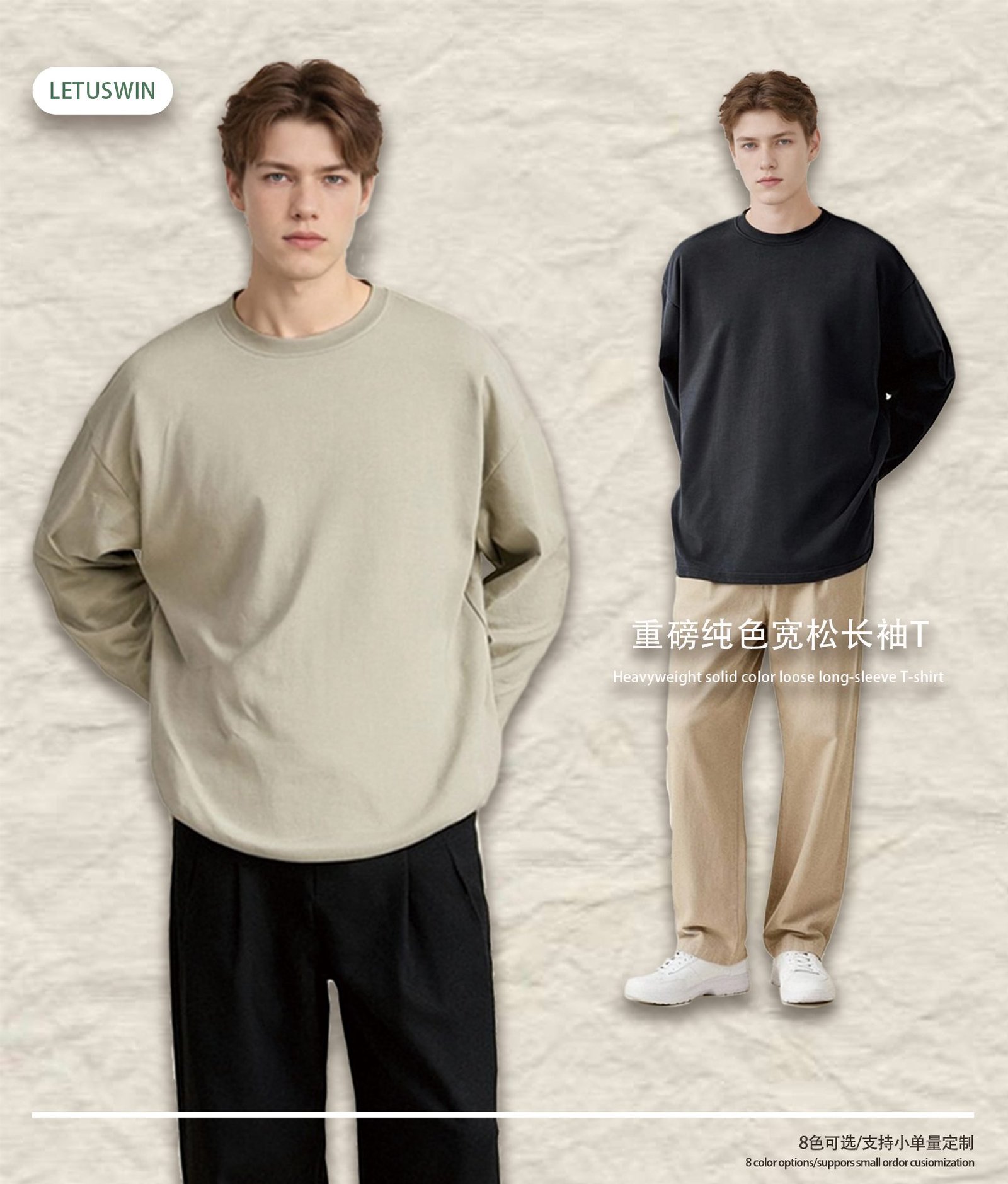 Introducing the Premium 425gsm Long Sleeve T-Shirt (Style A_M0186)Define comfort and style with the premium 425gsm Long Sleeve T-Shirt. This essential piece, style A_M0186, is crafted from heavyweight 100% cotton, offering a substantial feel and superior durability. Designed with a relaxed, oversized fit, it provides a contemporary streetwear silhouette that is both comfortable and on-trend.The 425gsm fabric weight ensures exceptional quality, making this t-shirt a standout base for any casual or street-inspired collection. Its versatility makes it suitable for both layering and standalone wear across seasons.This 425gsm Long Sleeve T-Shirt comes in a curated palette of 7 versatile, earthy tones. From core Black and Charcoal Grey to modern neutrals like Oatmeal Grey, Wheat, and Mocha, it offers a sophisticated color range for wholesale sourcing.Stock this high-quality blank (A_M0186) for your brand or customers. The heavy cotton construction is ideal for printing techniques and holds its shape perfectly. Order the premium 425gsm Long Sleeve T-Shirt in bulk for a reliable, high-demand product.